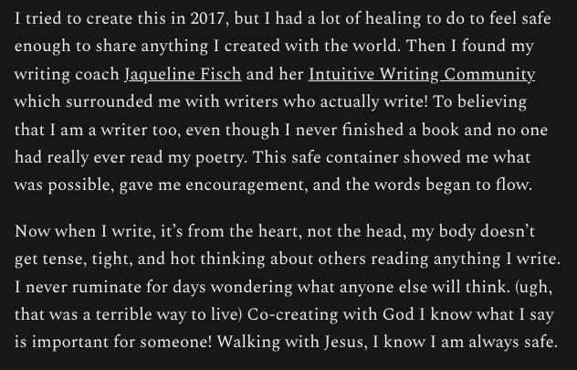 Feedback from an Intuitive Writing School Community member who is writing, publishing in a safe space from the heart